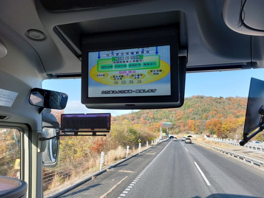 昨年同様、往路のバス内での時間を活用し、日本更生保護協会から借用したビデオ「心のリレー」を視聴し、こちらも併せて研修しました。